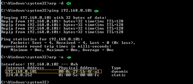 The First step is to clear the ARP Cache of both the host by typing following command in command prompt arp -d for Host A. Then Ping the Host A for the reply. Now type command arp -a, this will show you the physical (MAC) address of the Host A Machine.