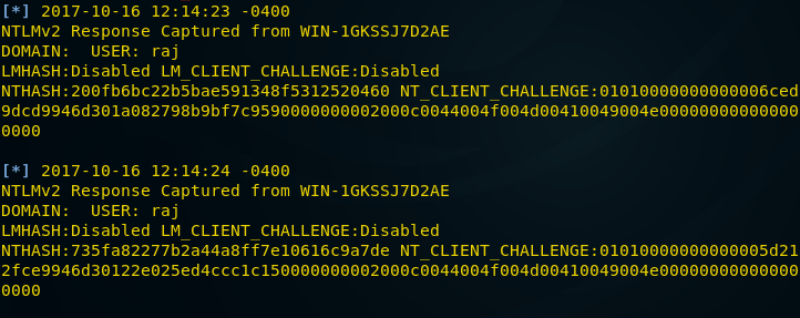 As the victim enter username and password, the attacker at background will capture NTLM hash on his system.