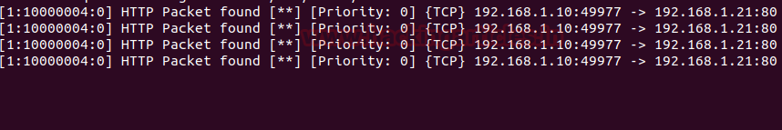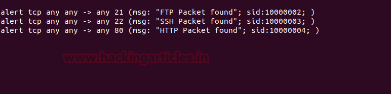alert tcp any any -> any 21 (msg: "FTP Packet found"; sid:10000002; ) alert tcp any any -> any 22 (msg: "SSH Packet found"; sid:10000003; ) alert tcp any any -> any 80 (msg: "HTTP Packet found"; sid:10000004; )
