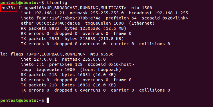 First, use the ifconfig command in your Ubuntu to check the interface. As you can see the image below the interface is ens33.