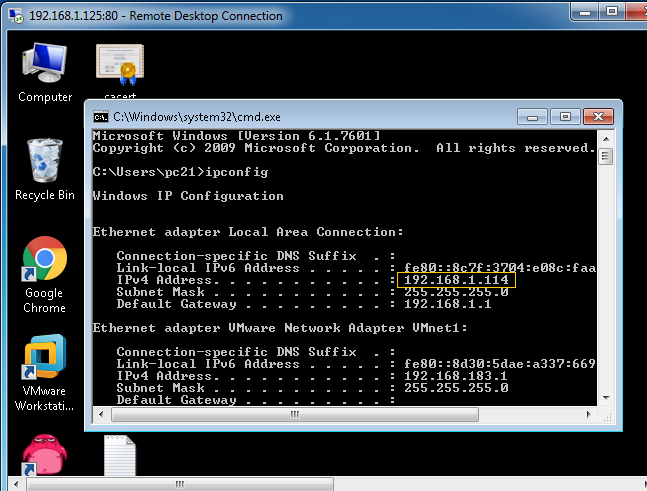 - Windows operating system (Remote server) holding IP: 192.168.1.114