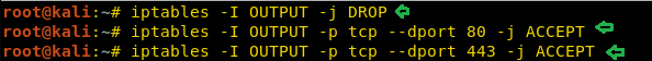 iptables -I OUTPUT -j DROP iptables -I OUTPUT -p tcp --dport 80 -j ACCEPT iptables -I OUTPUT -p tcp --dport 443 -j ACCEPT