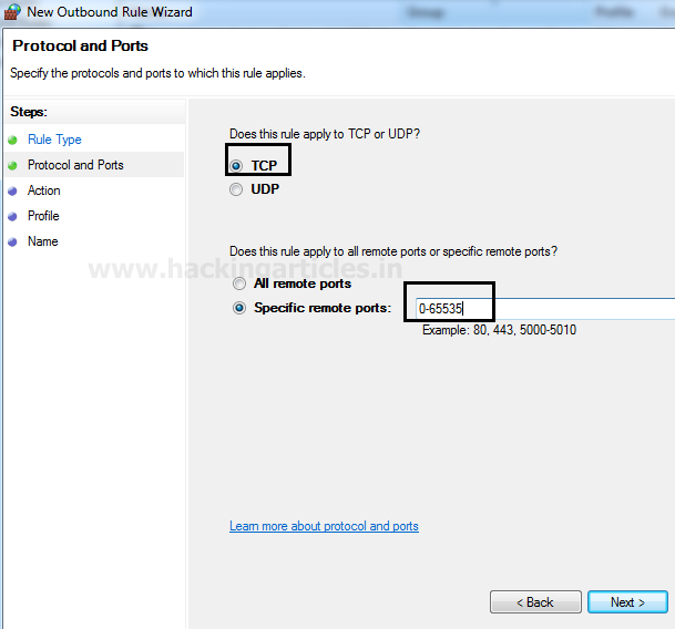 Again create another new rule in firewall outbound rules for applying a filter on outgoing traffic from your network. Enable Port option for creating a rule that controls connection for a TCP and does mention port 80,443 this time.