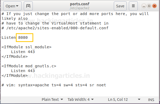 Here for security reason, we are editing listen port from 80 to 8080 and to do so open ports.conf file from inside /etc/apache and make desirable changes.