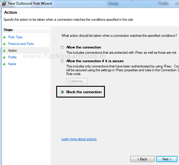 Choose Block option as action should be taken when a connection matches a specified condition.
