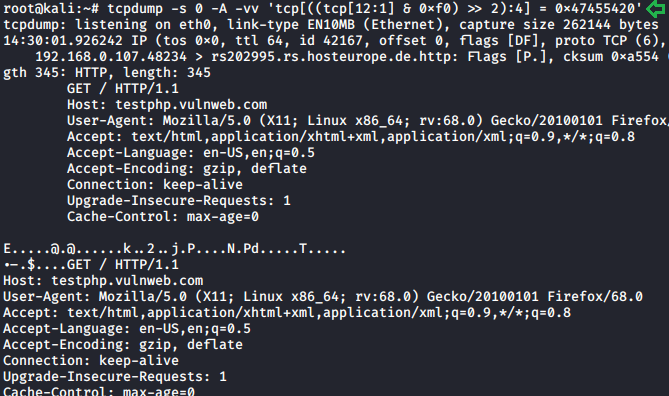 tcpdump -s 0 -A -vv 'tcp[((tcp[12:1] & 0xf0) >> 2):4] = 0x47455420'