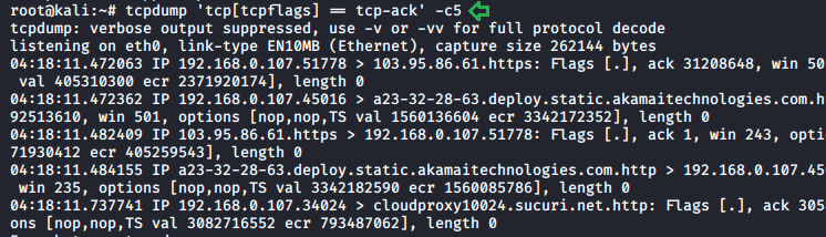 tcpdump 'tcp[tcpflags] == tcp-ack' -c5