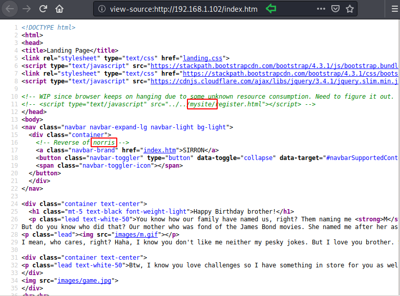 Unfortunately, I didn’t find any loophole or clue on the home page thus I surf for the given hyperlink “SIRRON” and that redirect to index.html page which similar as a home page but changes can be noted in its source code.