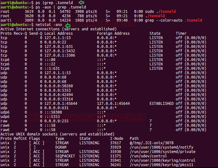 As I had said, if you check the network statistics using netstat, then you will not observe any process ID for tunnelshell. From the below image, you can observe that with the help of the ps command, I checked in process for tunnelshell and then tried to check its process ID through netstat.