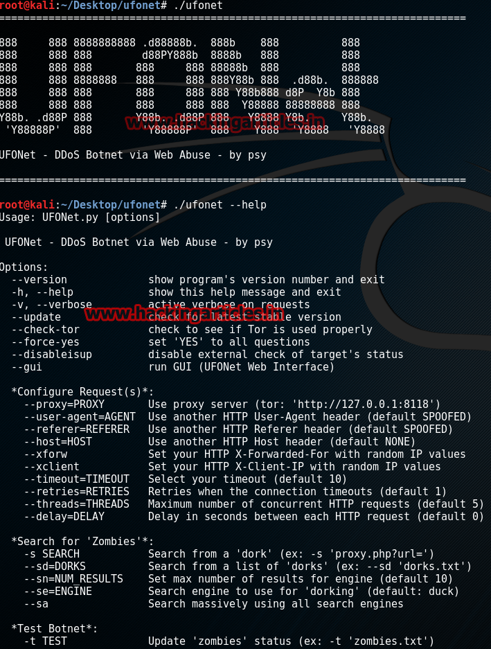 and extract it and enter the folder and open up the terminal and now list all the options available with this command ./ufonet –help