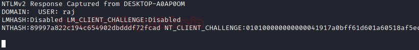 It will show the user that the logon failure, but the listener will capture the credentials. Here you can see that the listener has captured the user and the domain name. The listener has also generated an NT hash which John the Ripper can decrypt.