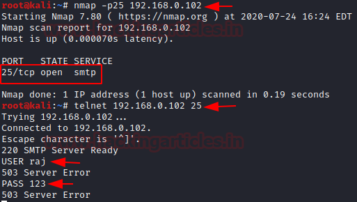 nmap -p25 <ip address> telnet 192.168.0.102 25