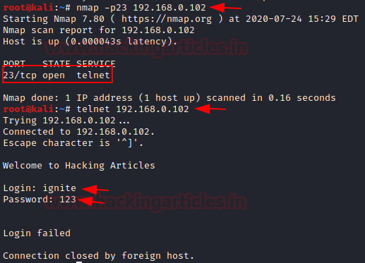 Then to lure the user into believing, it to be a genuine login page you can trick the user in opening the Telnet login page. It will display, ‘Welcome to Hacking Articles’ and it will ask the user to put his user Id and password.