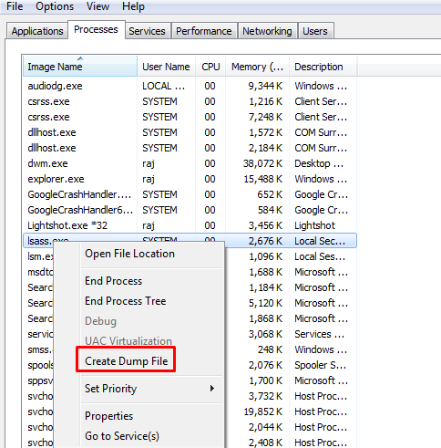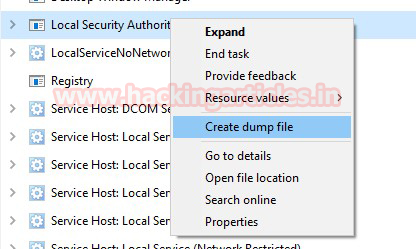 In your local machine (target) and open the task manager, navigate to processes for exploring running process of lsass.exe and make a right-click to explore its snippet. Choose “Create Dump File” option which will dump the stored credential.