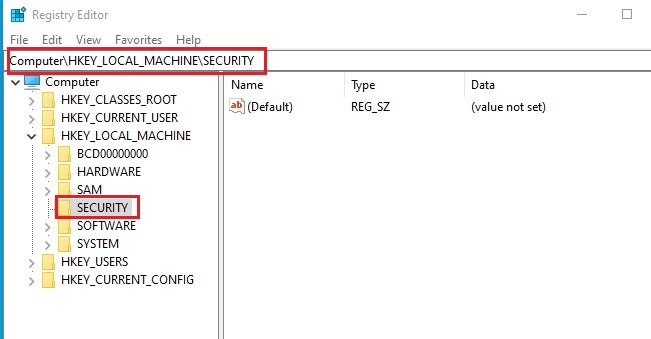 You can also do this locally by changing permission values inside the registry. Navigate to Computer\HKEY_LOCAL_MACHINE\SECURITY.