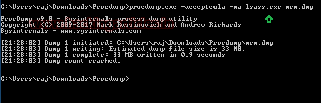 procdump.exe -accepteula -ma lsass.exe mem.dmp