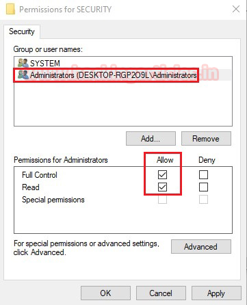 Allow “Full Control” to the Administrator user as shown.