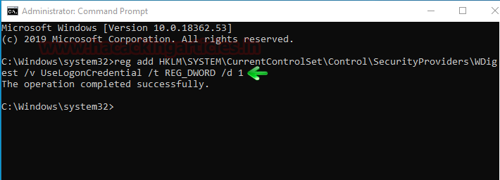 reg add HKLM\SYSTEM\CurrentControlSet\Control\SecurityProviders\WDigest /v UseLogonCredential /t REG_DWORD /d 1