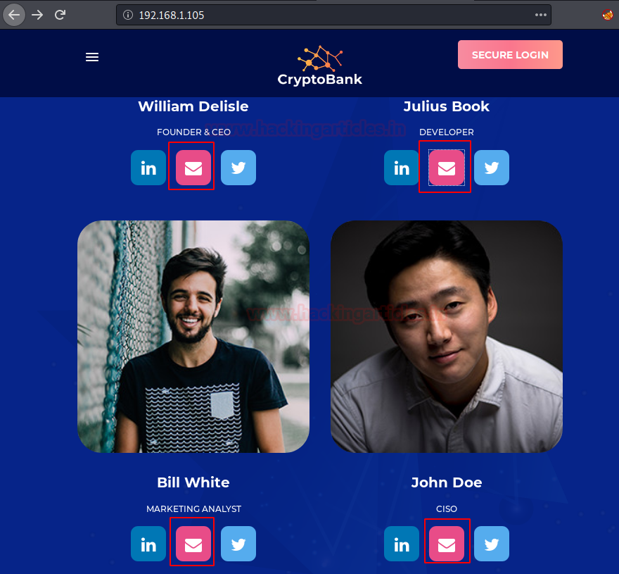 There was a Secure Login button on the top right-hand side of the webpage. It was not working as intended. It was trying to access http://cryptobank.local/trade. This means we need to make some changes in /etc/hosts. We thought we will get back to it later. Moving down and inspecting different links, we got to the CORE TEAM section. It contained the names of employees with their social links.