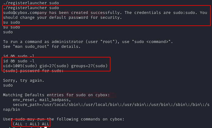 We register the user “sudo“, we authenticate with him, we check that everything is correct and of course, we check that we have high permissions.