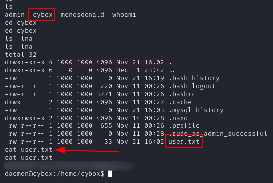 We access the directory “/home/Cybox” and read the flag of user.txt.