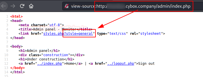 We open the site, it shows us that it is under construction, we check the source code and see that it calls the style sheet by means of a variable and from a php file.