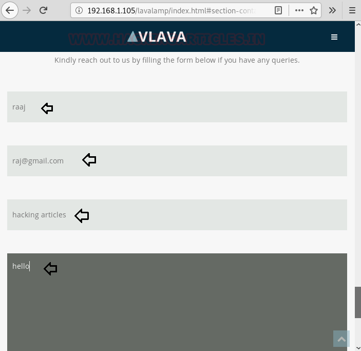 As a result, we fill out the contact form as shown in the image below and intercept the http request of the browser in the browser.