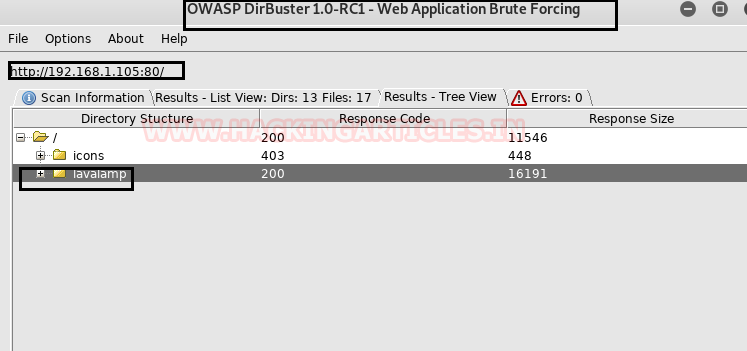 We continue this with the directory brute force attack and the dirbuster used for directory listing. As you can see, we’ve found a directory named /lavalamp to learn more about dirbuster, read the article from here.