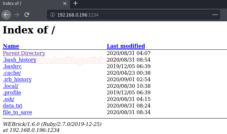Here the Ubuntu system is the victim machine. To upload the file from the victim system to the attacker system serve files in the local folder by running the HTTP server on port 1234, you can type;
